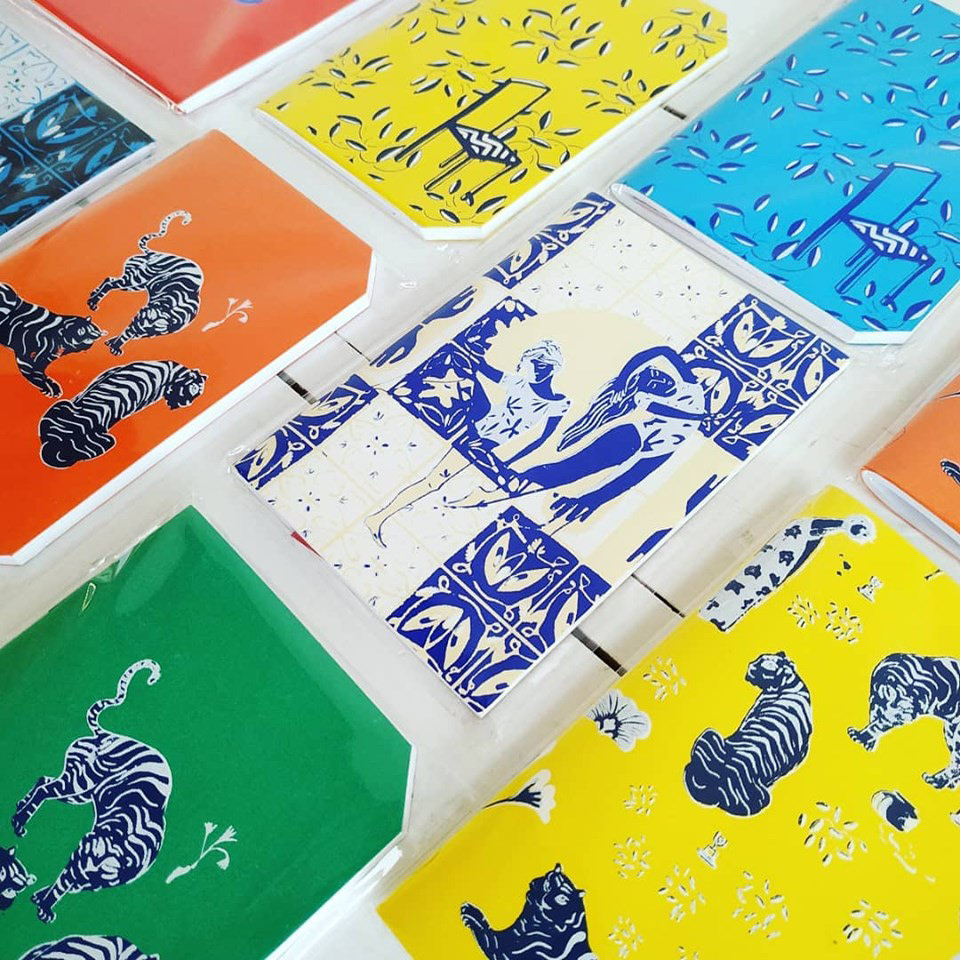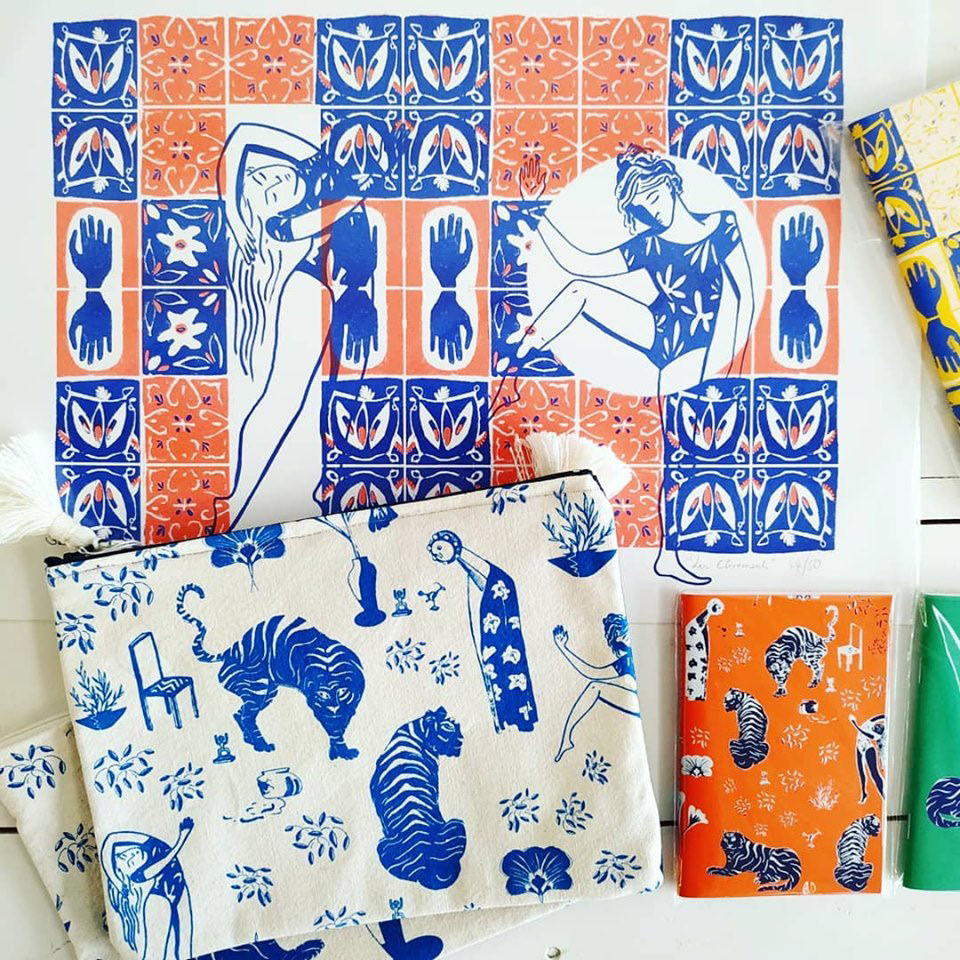 Carnets, pochettes & impressions édition limitées. Illustrations "Tigres" et "Les étirements" sérigraphiés sur papier en carnet ou sur tissu pochette puis façonné à la main. Impressions numérique A3 & carnets Jungle "Nuit Citron" façonné à la main. Tout ça disponible depuis le mois de Mai à la HAB Galerie ainsi qu'à la librairie de La Cantine du Voyage à Nantes!